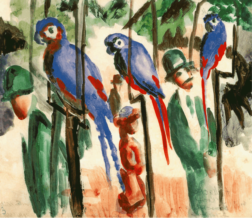 Peint au retour de Tunisie, quelques semaines à peine avant la mobilisation, Le Perroquet bleu montre un Macke à son point d’équilibre — un perroquet bleu cobalt perché sur un fond de végétation dense, verts superposés, jaunes chauds, une touche de rouge sombre. La composition est exubérante, sans mélancolie apparente. Rien dans cette toile ne ressemble à un adieu — c’est peut-être ce qui la rend si troublante. Il y peint avec la même curiosité, la même confiance dans la couleur, jusqu’au bout.