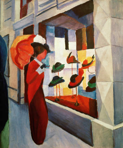 August Macke n’a pas eu le temps de vieillir — et sa peinture ne vieillit pas non plus. Elle garde cette qualité d’être ancrée dans son époque — les tenues 1910, les tramways, les devantures de boutiques — mais d’être aujourd’hui encore d’une modernité et d’une lisibilité insolentes.