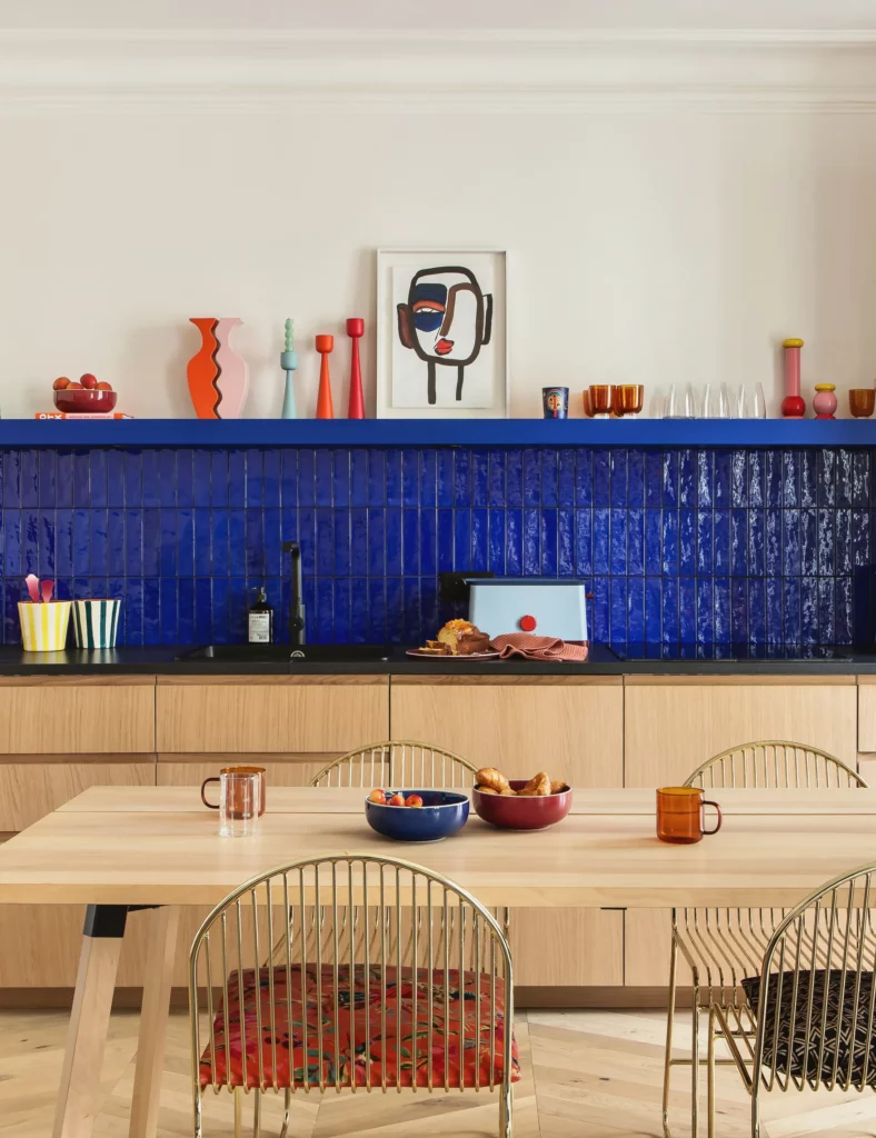 Appliqué en crédence dans la cuisine, le bleu électrique devient un véritable fond de scène. Il met en valeur la vaisselle, les objets du quotidien, et crée une rupture nette avec les plans de travail clairs ou en bois. Brillant ou mat, carrelé ou peint, il structure la cuisine sans l’alourdir.