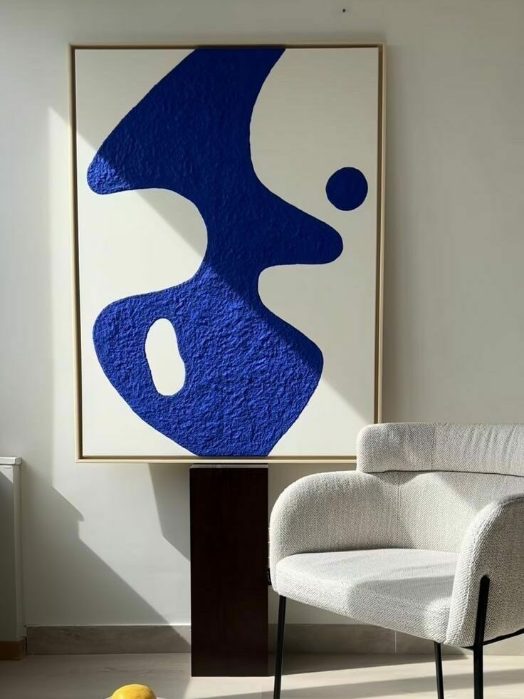 Face à un mobilier aux lignes douces et à des matières texturées, une œuvre graphique dominée par le bleu électrique agit comme un point d’ancrage visuel. La couleur devient ici langage artistique, presque sculptural, et dialogue avec la lumière naturelle.