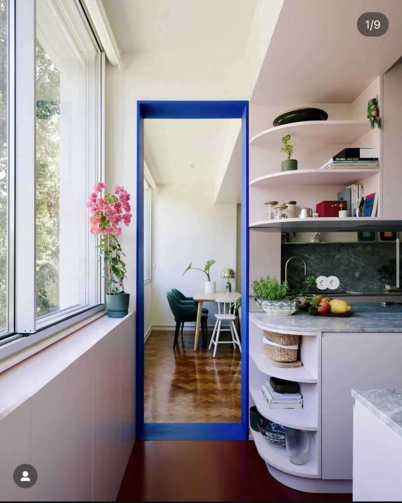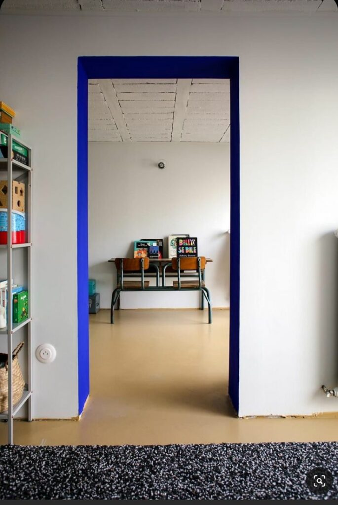 Un passage, un seuil, un cadre. Peint en bleu électrique, l’encadrement devient un élément architectural à part entière. Il structure la perspective, attire le regard et donne une profondeur immédiate à l’espace, tout en laissant les murs respirer.