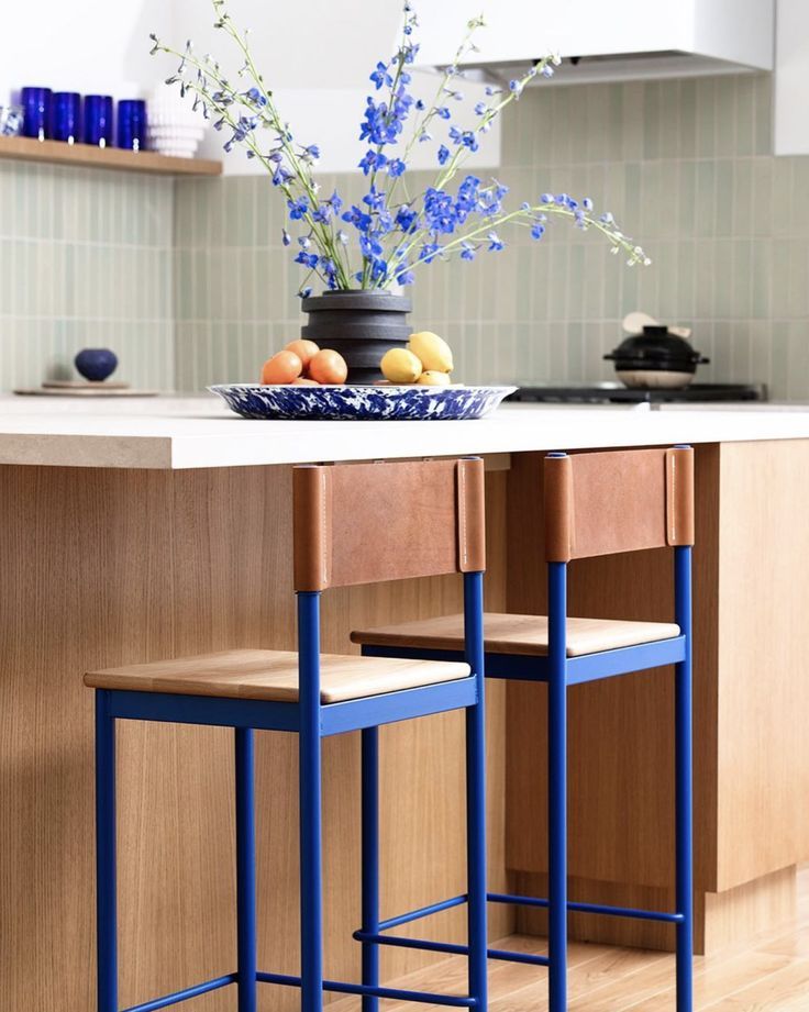 Dans cette cuisine baignée de bois clair et de céramique douce, le bleu électrique s’invite par la structure des tabourets. Un choix graphique, presque évident, qui souligne les lignes sans rompre l’harmonie. La couleur agit ici comme un trait, un rappel visuel, jamais comme un bloc.