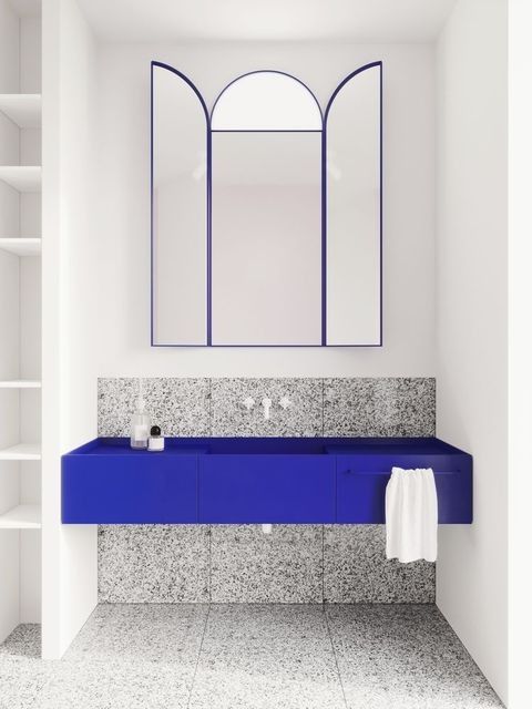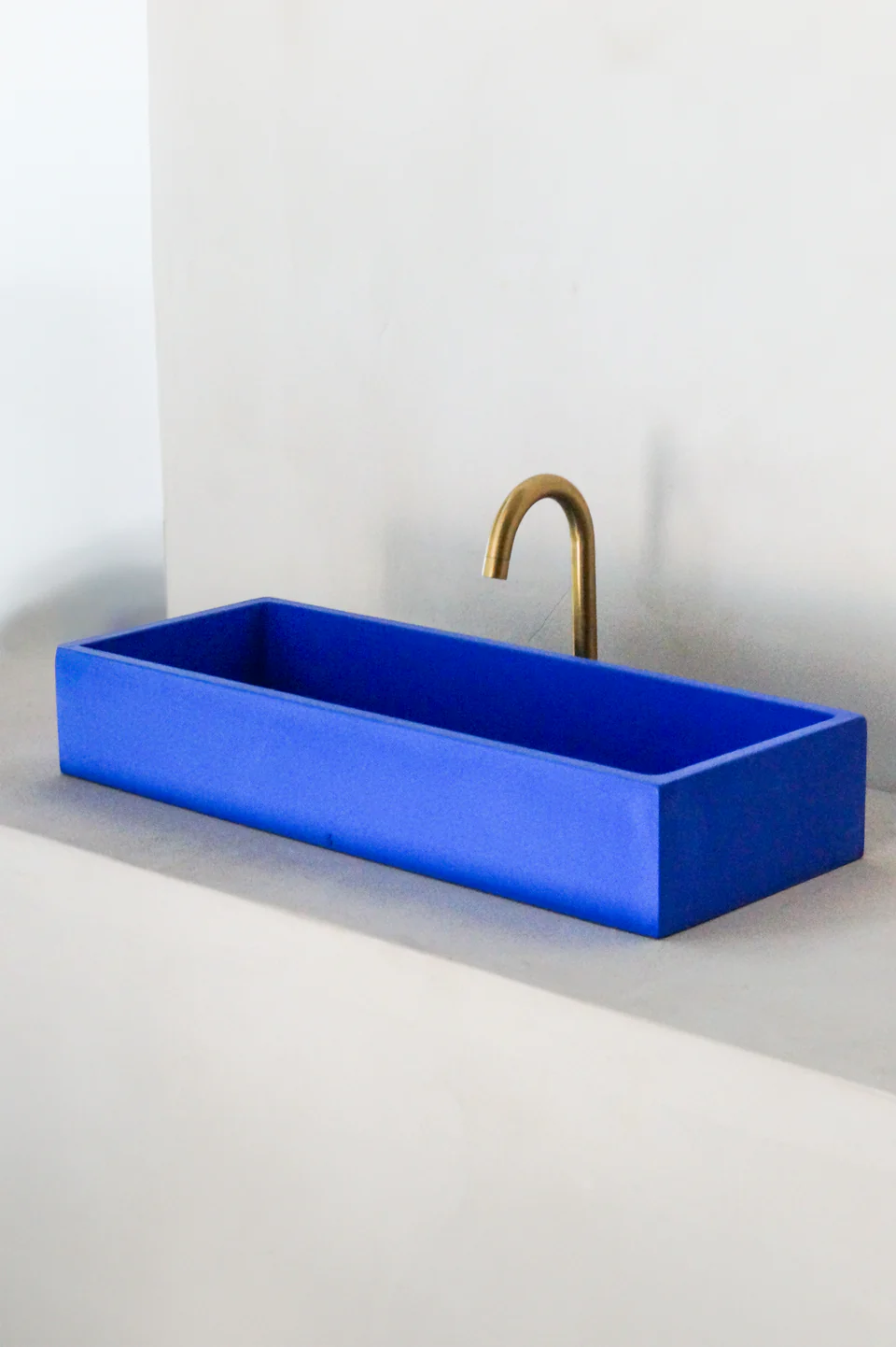 Un bleu franc, presque minéral, appliqué à une vasque en béton aux lignes simples. Ce qui frappe ici, c’est le contraste entre la matière brute et la couleur vibrante. La surface mate absorbe la lumière, adoucissant l’intensité du bleu. Une pièce forte, idéale dans une salle de bain épurée, associée à une robinetterie en laiton ou en inox brossé.