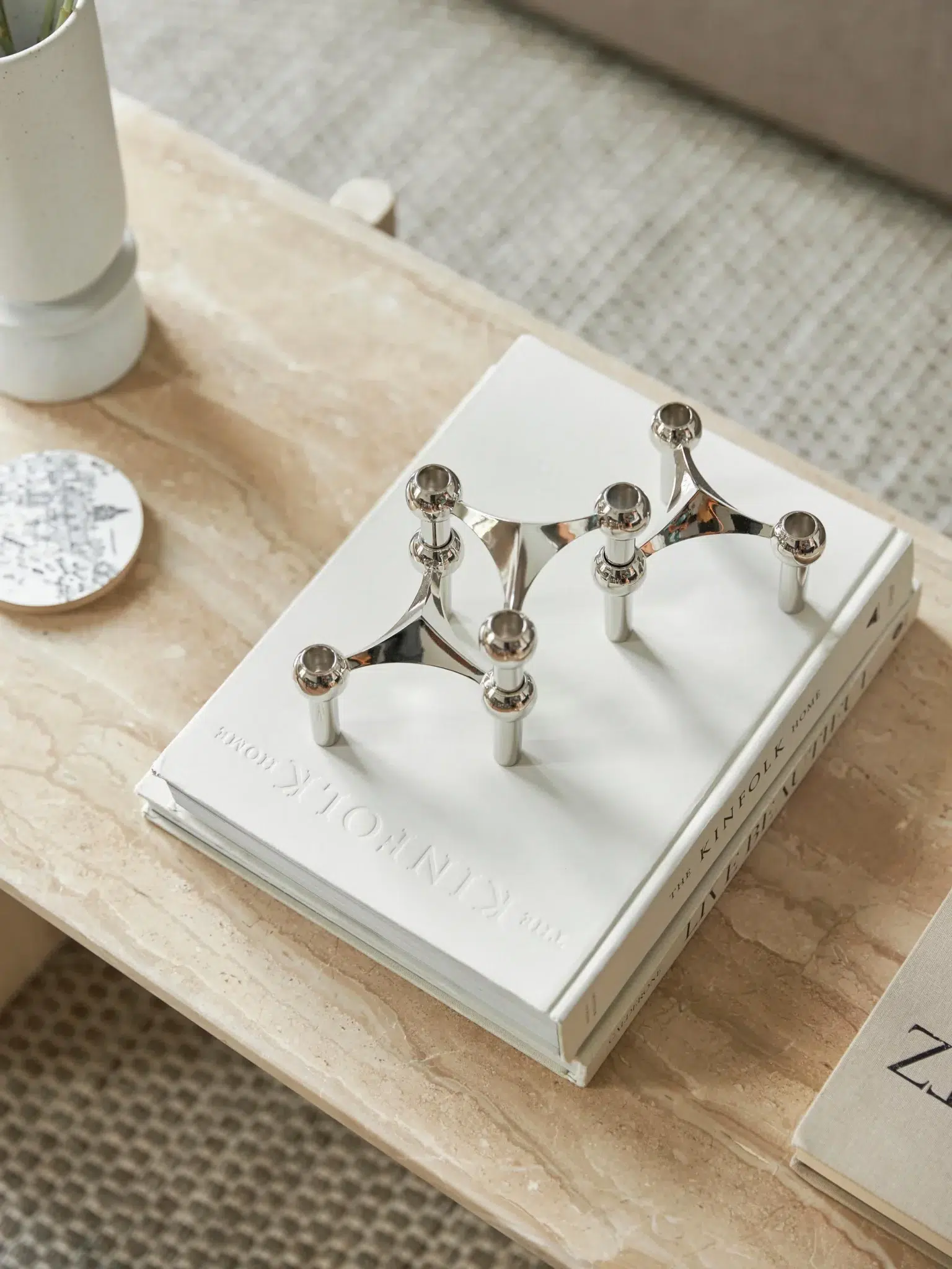 En accumulation, plusieurs modules réunis composent une présence presque architecturale. Sur une table de salle à manger, une console basse ou un centre de table généreux, l’effet peut être très beau — le Stoff Nagel aime l’espace, il n’a pas besoin d’être entouré de trop d’objets pour exister. Avec quelques chandelles fines, de hauteurs légèrement différentes, l’ensemble gagne en mouvement. La composition devient moins statique, plus sensible. Le regard circule entre les lignes, les vides, les reflets.
