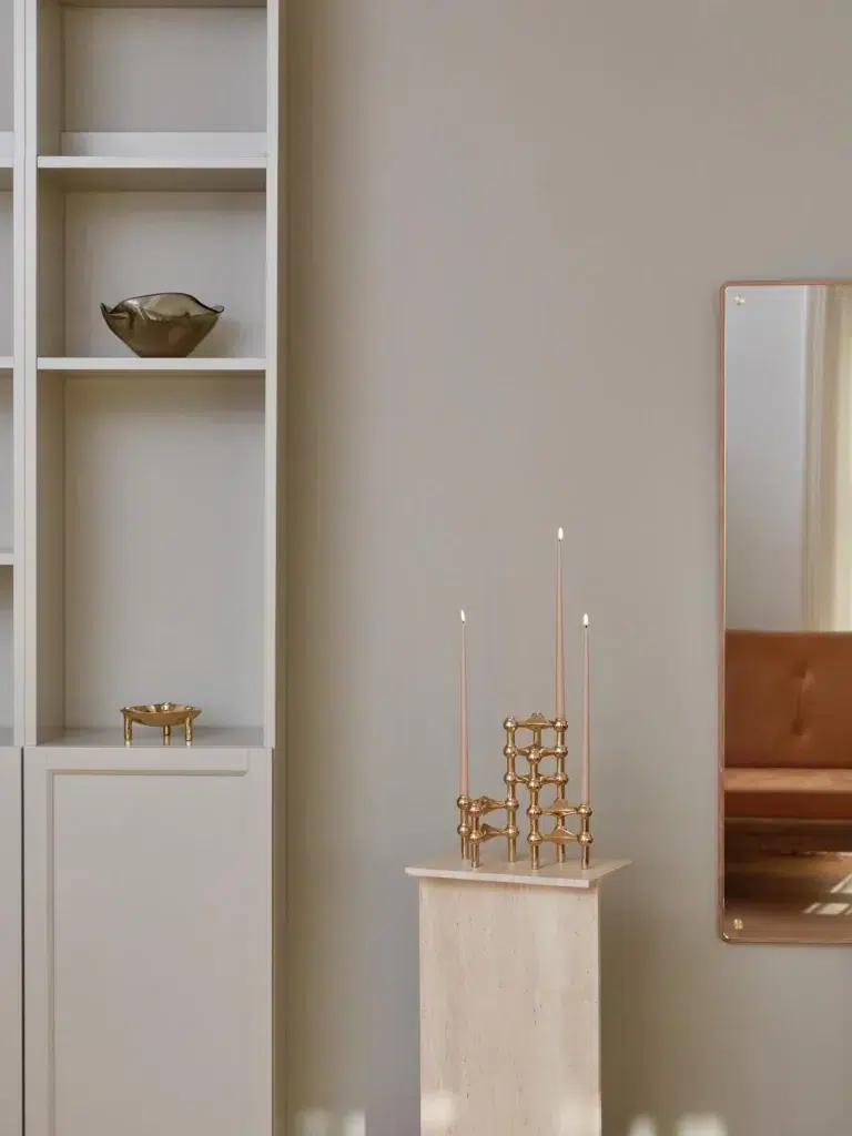Une embase ronde, une tige fine, un anneau. On pose le bougeoir et il tient — vraiment, sans la fragilité des pièces légères qui basculent au moindre frôlement. La tige crée un rapport de proportion entre la flamme et l’espace qui semble calculé. Rien n’est là pour faire « bien ». Le laiton a été choisi pour sa chaleur, pour la façon dont il réfléchit la lumière sans être clinquant, pour sa capacité à se patiner plutôt qu’à se ternir.