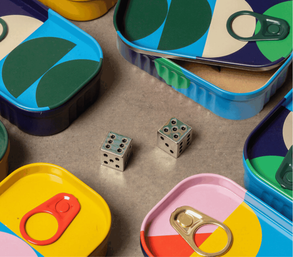 Deux petits dés en métal au poids agréable, dans une jolie boîte de conserve colorée à mi-chemin entre accessoire, presse-papier et jeu. musee-orangerie.fr